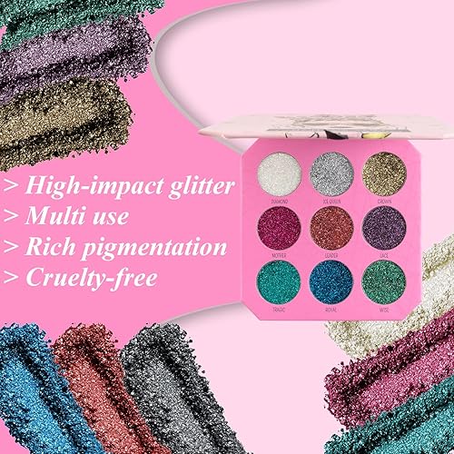 9 MESMERIZING GLITTER SHADES: From bold jewel tones to sparkling neutrals, this palette offers a diverse range of 9 high-impact glitter shades, catering to various preferences and moods.