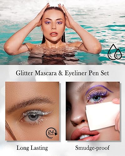 Colored Mascara And Eyeliner Makeup Duo - The makeup set include glitter mascara de pestañas and liquid eyeliner pen. Our diamond glitter mascara makes your lashes sparkle with a single brush. And our metallic eyeliner provides a shiny, reflective look. The elegant and radiant pearlescent offers a multi-angle glow in different light. This glitter eye combo will make you be center in the crowds.