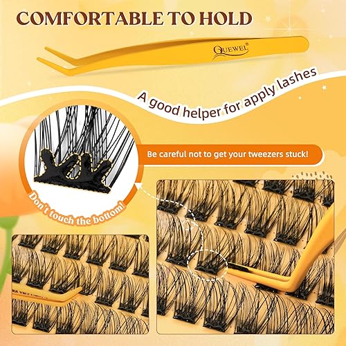 Upgrade No Glue Eyelashes: The newly upgraded self adhesive lash clusters avoid the problem of easily falling off. We designed a V-shaped strong adhesive strip to better hold your eyelashes. No need to worry about the eyelash clusters falling off, they are not sticky. QUEWEL's new self adhesive lash clusters avoid this problem!