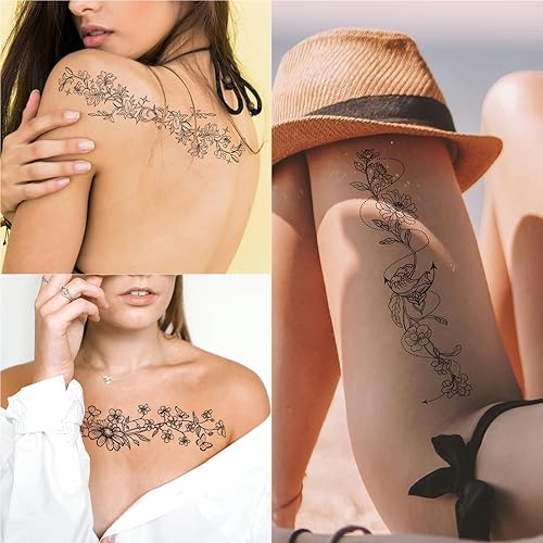 ✔[LONG LASTING & WATERPROOF] Long Black Flower Fake Tattoos That Looks Real And Last Long For 3-7 Days Durable Fashion Designs DIY Customized Creative Temp Tattoos For Women Adult Realistic Black Long Wild Floral Butterfly Natural Plants Moon Sketch Leaf Botanical Branch Flower Theme Tatuajes Temporales Men Mangas Woman Para Resistentes Al Agu