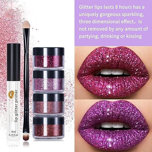 Sheglittary Glitter Lip Kit, 4 Color Glitter Lipstick With Lip Primer and Brush, Sheglittary Glitter Lip Gloss, Waterproof and Smudge Proof Lip Gloss (#B)(#B)