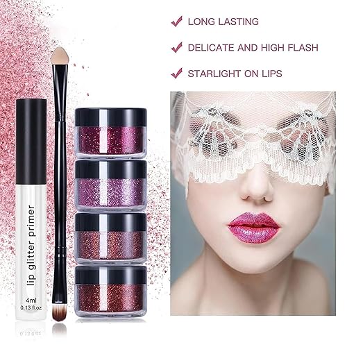 Sheglittary Glitter Lip Kit, 4 Color Glitter Lipstick with Lip Primer and Brush (Shiny Diamond & Metallic Lip) (Waterproof Smudge Proof) Long Lasting Shiny Lips for Makeup Lips Art (Warm Color)