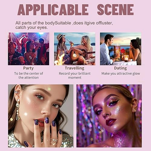 MULTI-PURPOSE DESIGN : This versatile spray isn't just for the face! Use it as a glittery eyeshadow, a shimmery blush, or a body glitter spray. Perfect for adding a touch of sparkle to your hair, neck, collarbone, or any area you want to shine. Suitable for all your makeup and body enhancing needs.