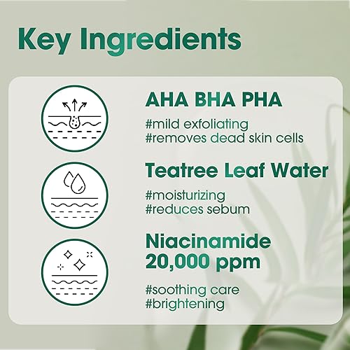 MIRACLE TONER : The Korean toner helps to refine skin texture in the first step of skincare, ensuring a smooth base for makeup application. This AHA BHA toner is particularly effective due to its inclusion of AHA/BHA/PHA ingredients, which gently exfoliate dead skin cells and impurities, leaving the skin clear and smooth. Additionally, the high concentration of tea tree extract in this pore care toner soothes and treats troubled skin, making it an essential part of any Korean skincare routine