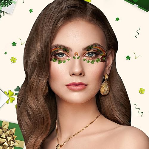 Festive St. Patrick’s Day Accessory: These sparkling Shamrock face tattoos are the perfect way to add a touch of luck and glam to your St. Patrick's Day ensemble, featuring green clover and hat that capture the spirit of the holiday in a dazzling and delightful way.