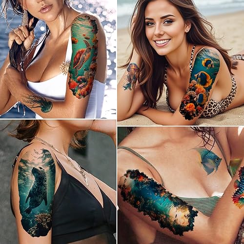 【Temporary Tattoo for Women and Men】Our realistic waterproof fake tattoo stickers are suitable for adults kids, can be attached to arms, legs, these realistic fake tattoos can be worn anywhere you like.these half arm ocean fish fake tattoos are very suitable for beach parties and pool parties.the temporary tattoo stickers are waterproof.