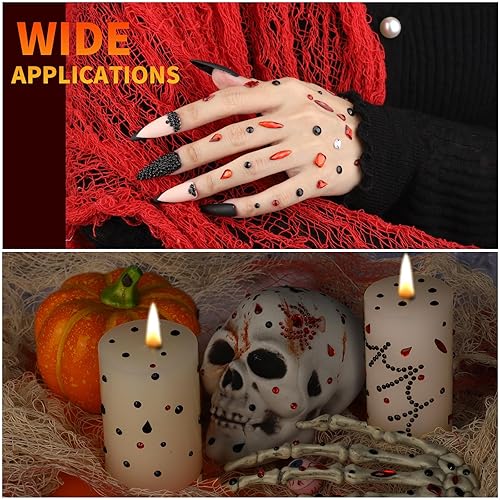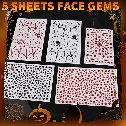 Self-Adhesive Face Gems for Halloween Makeup: Elevate your makeup game with our self-adhesive face jewels, which includes five sheets featuring vibrant round rhinestones in red and black colors, as well as unique shaped rhinestones regarding halloween themes. These gems are perfect for crafting standout Halloween looks or enhancing your everyday beauty routine with ease and flair