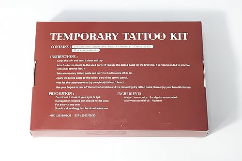 RICH TEMPORARY TATTOO KIT - Contains tattoo templates (51 patterns),4 tattoo inks in 3 colors (black Maroon Cherry Red),4 disposable gloves 1 pack of cleaning supplies for a hassle-free temporary tattoo experience.