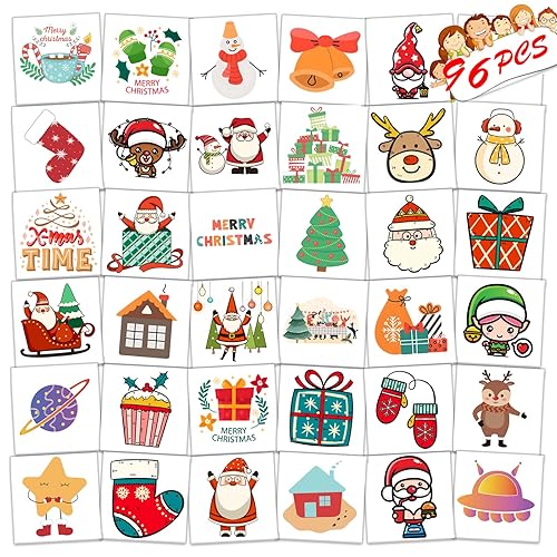 Temporary Tattoos, 96Pcs Temporary Tattoos for Kids Christmas Fake Tattoo for Kids Teens Individually Sheets Waterproof Kid Tatoo Cute Tatoos Girls Glitter Tattos Party Decoration(Christmas)(Christmas)