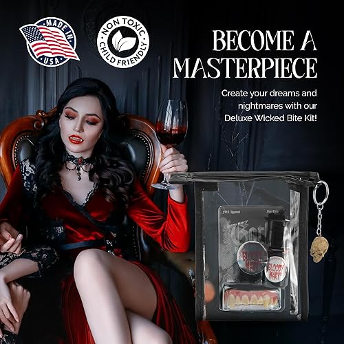 Vampire SFX Makeup Kit - Deluxe Wicked Bite Special Effects Face Makeup with 1/2 Oz. Extra Thick Fake Blood, Black Pencil Liner, Vampire Fangs and Stipple Sponge for Halloween or Stage - Bloody Mary