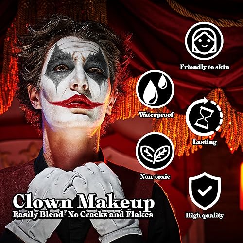 【Vegan & Cruelty-Free】The clown/joker makeup kit is formulated with non-toxic and gentle ingredients, and the face paints have decent pigments, delivering flawless full coverage on skin, highly pigmented, waterproof and sweat-proof. Suit for alll skin type.Lead-free