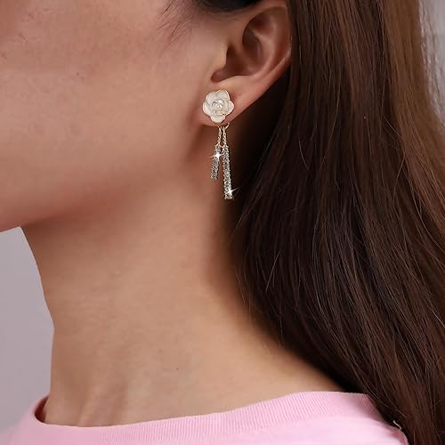 Vintage Crystal Flower Drop Earrings Pearl Camellia Earrings White Camellia Stud Earring Gold Linear Rhinestone Earring Jewelry for Women