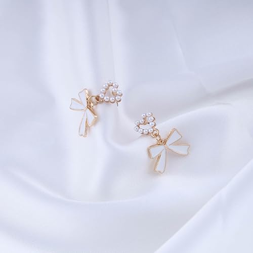 Vintage Pearl Bow Dangle Earrings Pearl Heart Earrings Gold Pearl Bow Stud Earrings Pearl Heart Bridal Earrings Jewelry for Women