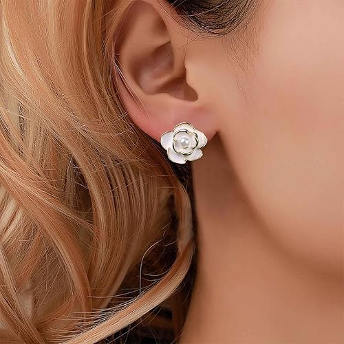 Vintage Pearl Flower Earrings Camellia Flower Stud Earrings Enamel White Flower Petal Earrings Gold Pearl Stud Earrings Jewelry for Women