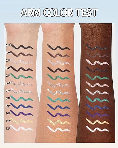 Soft cream texture in 12 colors: the smooth and soft eyeliner pen delivers 12 shades including classic black, brown, pink, purple, green, silver, blue, white, gold and coffee. Four shades (light pink, meat pink, silver, and champagne gold) are glitter gel pens, while the others are matte, which is suitable for most skin tones.