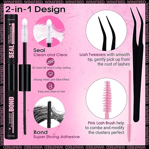 In this lash clusters kit product you will get: 1 pack wispy lashes clusters; 2-in-1 lash bond and seal, with super strong hold adhesive experience; lash tweezers with smooth tip; lash brush to modify the clusters. Just choose WINIFRED lash extension kit with confidence!
