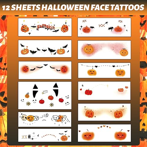 winthrop 12 Sheets Halloween Pumpkin Freckle Face Tattoos for Kids, Cute Temporary Face Stickers with Pumpkin Bat Spider Web Designs, Waterproof Party Makeup Stickers for Trick or Treat Goodie Bags