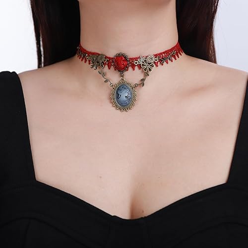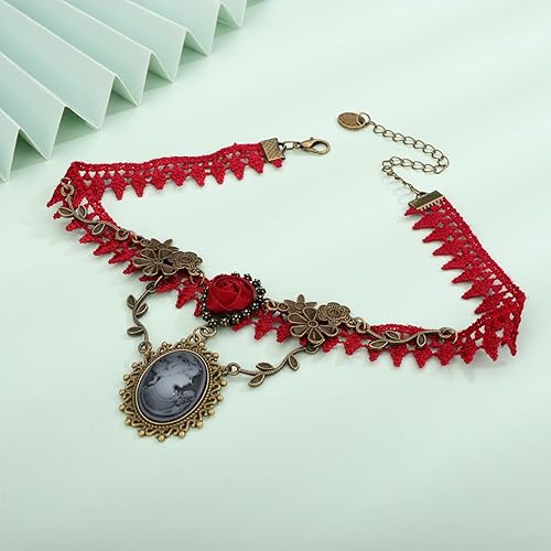 Xerling Gothic Red Rose Lace Choker Floral Portrait Pendant Choker Grunge Necklaces for Women Halloween Costume