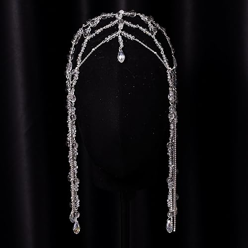 Xerling Transparent Crystal Beads Tassel Cap Headpiece 1920s Flapper Layered Head Chains Wedding Bridal Head Jewelry Cleopatra Hair Accessories for Women