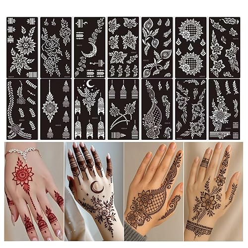 Xmasir Henna Tattoo Stencils Kit, 14 Sheets Temporary Tattoos Template Airbrush Indian Flower Body Art Tattooing for Women Girls Hands Forearm(Dark Black)