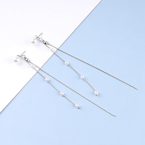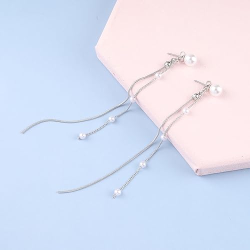 YienDoo Boho Long Pearl Dangle Drop Earrings Vintage Silver Pearl Chain Dangle Earrings Statement Tassel Pearl Dangle Earrings Wedding Prom Pearl Earrings Jewelry for Women